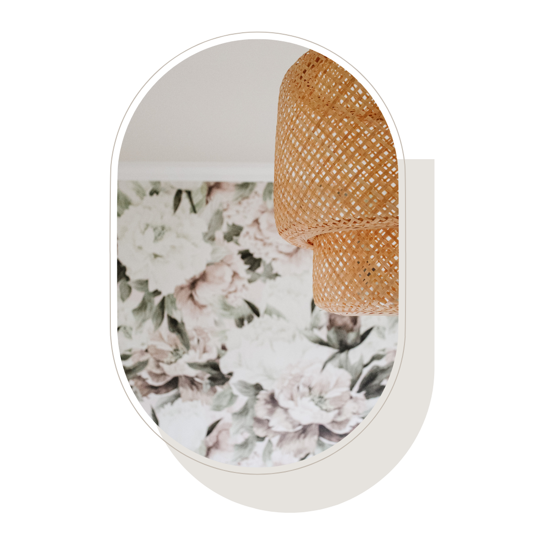 an image of beautiful floral wallpaper and a rattan woven chandelier